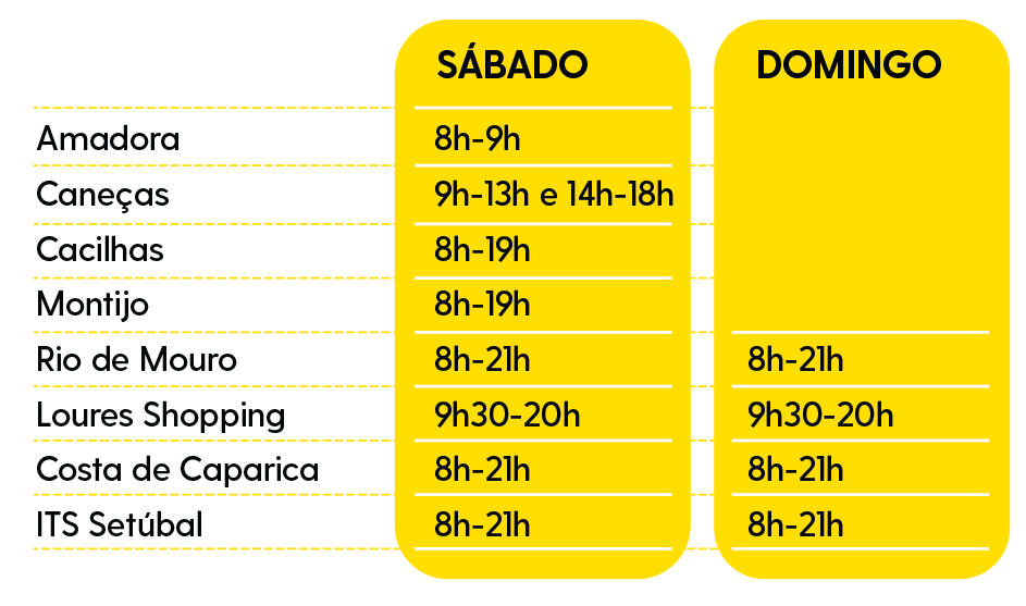 · Amadora, Cacilhas e Montijo – sábado, das 8h00 às 19h00;
