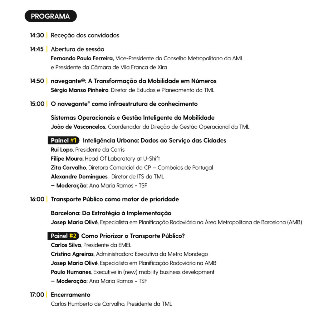 O evento terá assim uma breve apresentação do percurso do navegante®, destacando métricas de utilização, integração de operadores e modos de transporte, cobertura territorial e impacto na mobilidade metropolitana, permitindo contextualizar a evolução e o desempenho do sistema até ao momento.